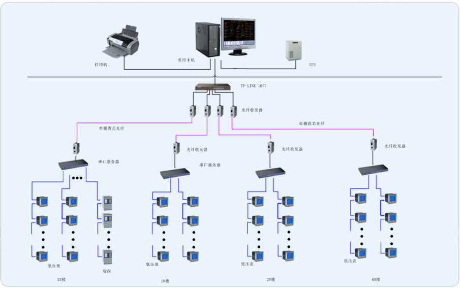 本次項目為制造工程技術(shù)大樓的電力監(jiān)控系統(tǒng)。通過利用原本已安裝的智能儀表,將原非智能儀表更換為智能儀表。通過組建系統(tǒng)網(wǎng)絡(luò),實時監(jiān)測變電所內(nèi)各個回路的電流、電壓、功率、開關(guān)狀態(tài)等電參量,由此達到變電所少人值守或無人值守的智能化管理。