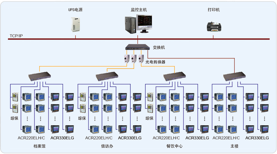 該項目采用Acrel-2000電力監(jiān)控系統實現了海門行政中心4座樓內(主 樓、A樓、B樓、H樓)電力系統的智能管理。項目值班室位于主樓負一層變配電室內,主樓變配電室主要設備是:ACR220EL/KC、ACR330EL/KC可編程智能電測表共96塊,配置一臺工業(yè)網絡交換機;A樓變配電室主要設備是:ACR220EL/KC可編程智能電測表共63塊,現場采用8根總線,使用一臺8口的串口服務器,通過光纖連接至主樓值班室內的交換機上;B樓變配電室主要設備是:ACR220EL/KC可編程智能電測表共59塊,現場采用6根總線,使用一臺8口的串口服務器,通過光纖連接至主樓值班室內的交換機上;H樓變配電室主要設備是:ACR220EL/KC可編程智能電測表共105塊,采用5根總線,使用一臺8口的串口服務器,通過光纖連接至主樓值班室內的交換機上;再通過交換機把數據傳輸到工控機。上述設備均相互獨立完成各自的功能,不依賴主控計算機運行,具備RS-485 通信接口,通過現場的RS-485總線將檢測到的各項電參數和狀態(tài)信號實時傳輸到中間層的數據處理單元—串口服務器。