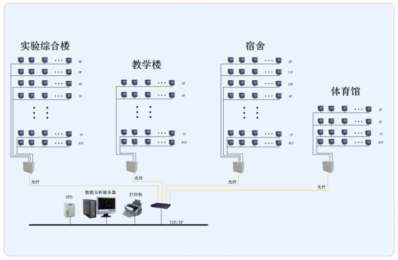 安科瑞Acrel-5000建筑能耗分析管理系統(tǒng)根據(jù)上海復(fù)旦中學(xué)西部校區(qū)現(xiàn)場實際情況,整體網(wǎng)絡(luò)結(jié)構(gòu)采用屏蔽雙絞線直接接至樓層弱電井的數(shù)據(jù)采集器然后通過光纖將數(shù)據(jù)上傳至的監(jiān)控主機。該系統(tǒng)主要采用分層分布式計算機網(wǎng)絡(luò)結(jié)構(gòu),站控管理層、網(wǎng)絡(luò)通訊層和現(xiàn)場設(shè)備層。