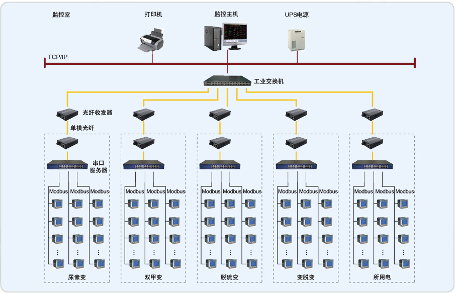 本項(xiàng)目針對(duì)現(xiàn)場3個(gè)低壓配電室(A、B、C)內(nèi)安裝的100只左右電力儀表。監(jiān)控室在A配電室內(nèi),B配電室距離A配電室200米左右,儀表為20只左右。另一個(gè)C配電室距離A配電室600米左右,儀表為40只左右。