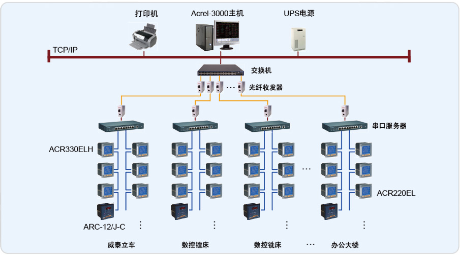 整個系統(tǒng)采用Acrel-3000型電能管理系統(tǒng),完成了對威泰立車公司、數(shù)控鏜床公司、數(shù)控銑床公司、武漢善福公司、武重鑄鍛公司、大件加工廠、中小件加工廠、辦公大樓8個單位13個配電室各回路的電能監(jiān)測和管理。其中低壓進線回路裝安科瑞ACR330ELH,低壓功率因數(shù)補償回路ARC-12/J-C型功率因數(shù)自動補償控制儀,其它回路配置ACR220EL網(wǎng)絡電力儀表。整個系統(tǒng)采用網(wǎng)絡分布式結構,監(jiān)控主機位于10KV監(jiān)控室內(nèi),系統(tǒng)采用開放的通訊協(xié)議,通過現(xiàn)場總線連接到通訊服務器 NPort5430 。13個配電室通過光纖組網(wǎng)與低壓配電系統(tǒng)相連,實現(xiàn)數(shù)據(jù)通訊功能。