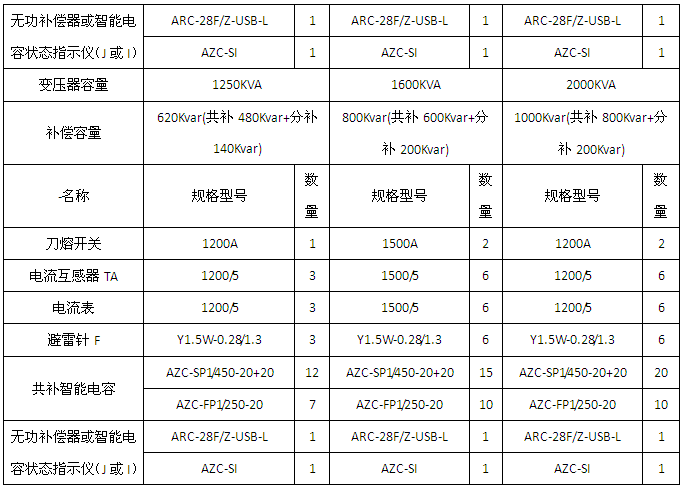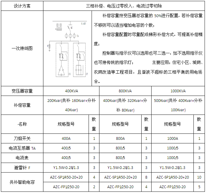 變壓器容量為400/800/1000/1250/1600/2000KVA的單相、三相混合補償應用方案