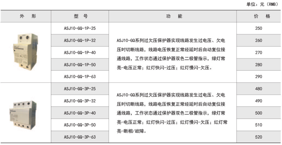 ASJ10-GQ系列自復式過欠壓保護器(以下簡稱ASJ),適用于單相交流電壓230V或三相電壓400V,頻率50Hz,額定工作電流至63A及以下的用戶或負載。由中性線故障引起的單相或三相線路過、欠電壓時,保護器對用電設備進行保護。