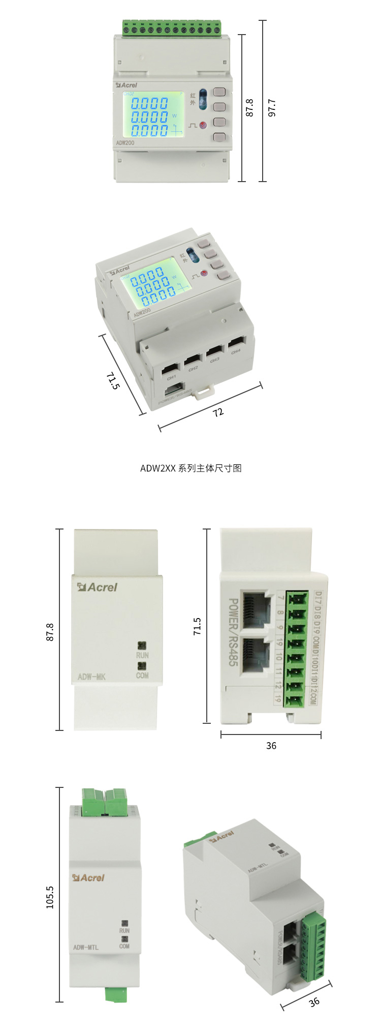 ADW2xx系列導(dǎo)軌式多回路電力儀表方便用戶(hù)進(jìn)行用電監(jiān)測(cè)、集抄和管理。可靈活安裝于配電箱內(nèi),實(shí)現(xiàn)對(duì)不同區(qū)域和不同負(fù)荷的分項(xiàng)電能計(jì)量,統(tǒng)計(jì)和分析。