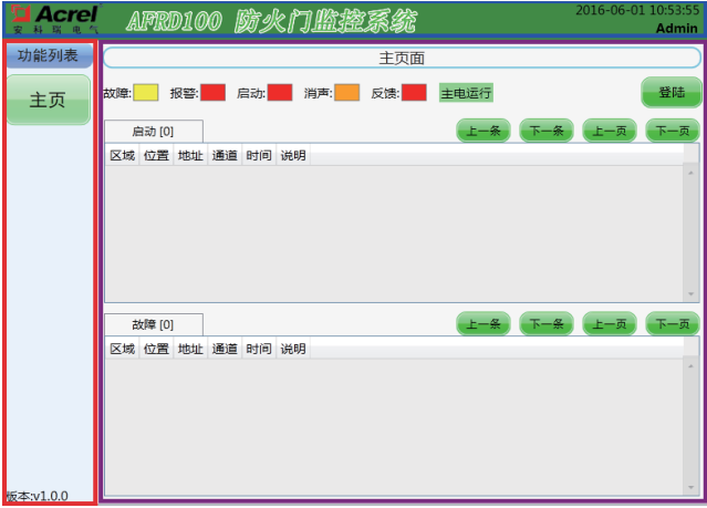 包含“登陸”按鈕、“界面標題”、“功能列表”、“系統(tǒng)狀態(tài)欄”四部分組成,可以快速查詢當前監(jiān)控狀態(tài),也可用于工作人員登錄操作。