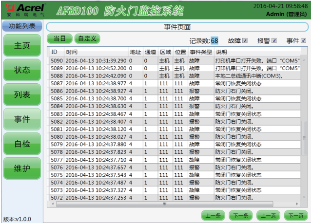 該界面可顯示當前存儲的報警記錄、故障記錄和事件記錄,可選擇查詢當天記錄也可以自定義查詢?nèi)掌凇?/p>