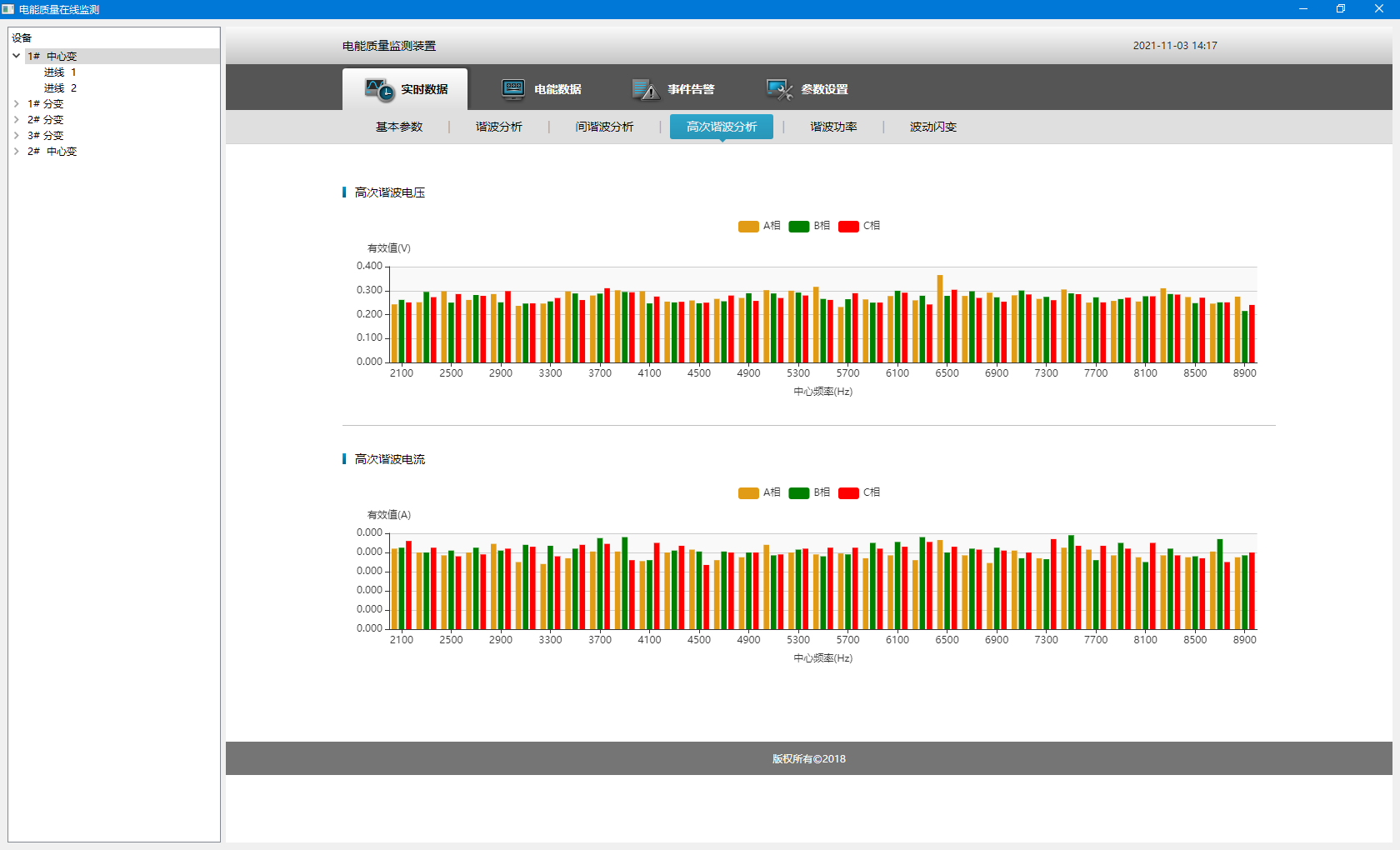 實時監(jiān)測總進線和重要出線回路的供電電源電能質量,包括穩(wěn)態(tài)數據監(jiān)測、暫態(tài)數據監(jiān)測和故障錄波分析。對供電系統(tǒng)中的電壓偏差、頻率偏差、三相電壓不平衡、三相電流不平衡、2~63次諧波電壓、2~63次諧波電流、0.5~63.5次間諧波電壓、0.5~63.5次間諧波電流、諧波功率、諧波畸變率等實時監(jiān)測,并以柱狀圖進行諧波分析。