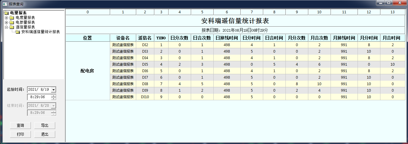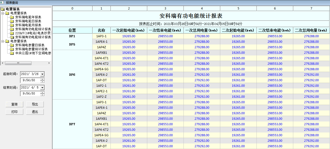 Acrel-1000綜合自動化監(jiān)控系統(tǒng)可以查詢各回路或設備指定時間的運行參數,報表中顯示電參量信息應包括:各相電流、三相電壓、總功率因數、總有功功率、總無功功率、正向有功電能、溫度值等。可以按照日、月、年的格式進行查詢、導出、打印。